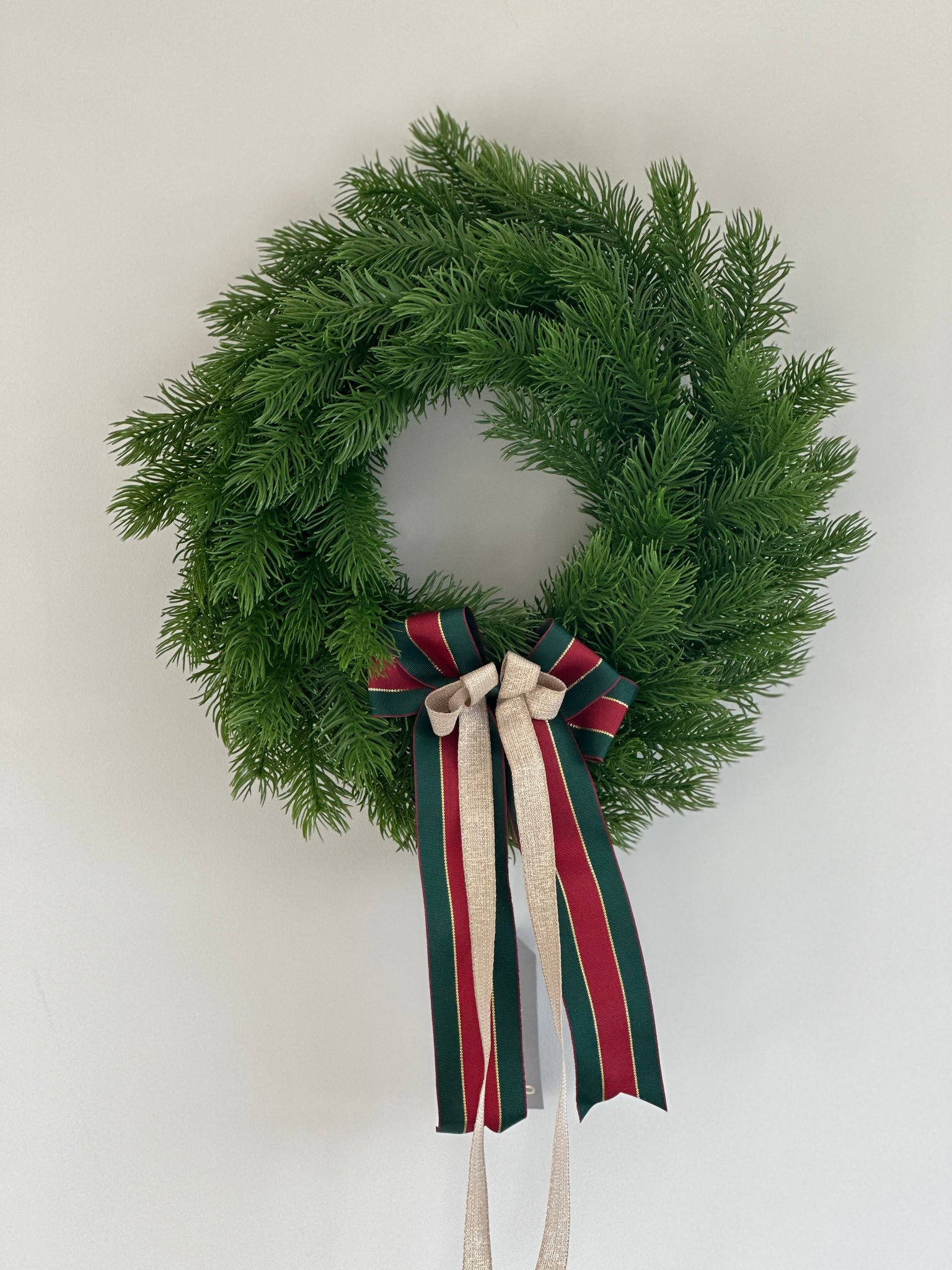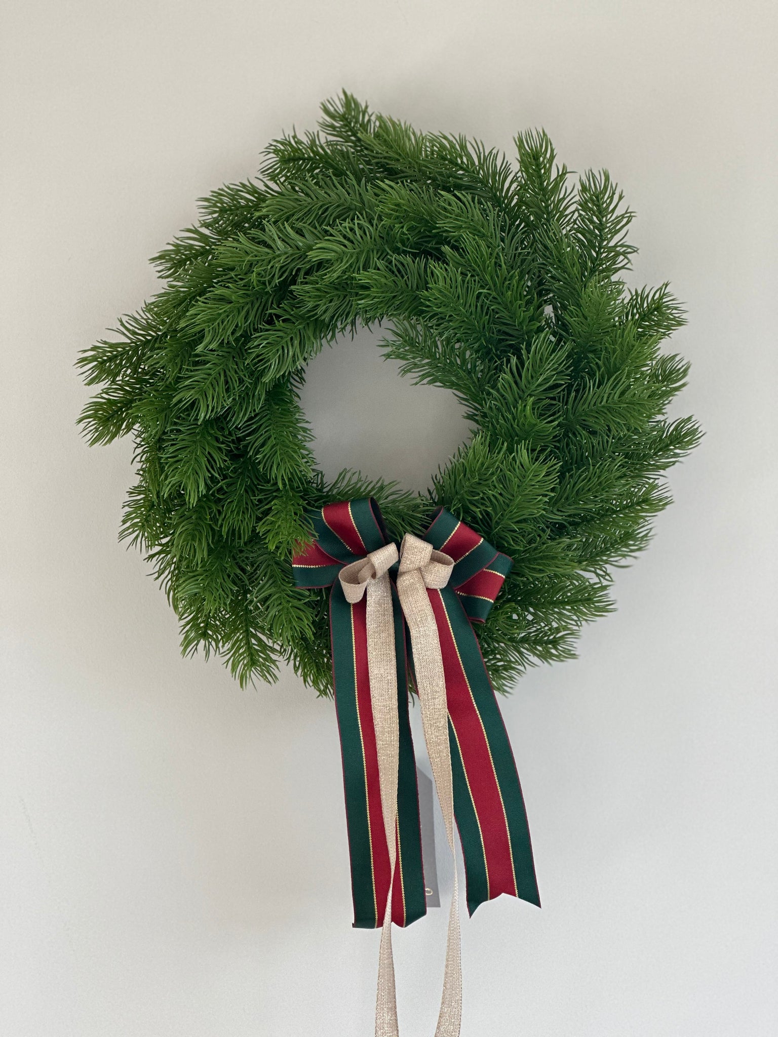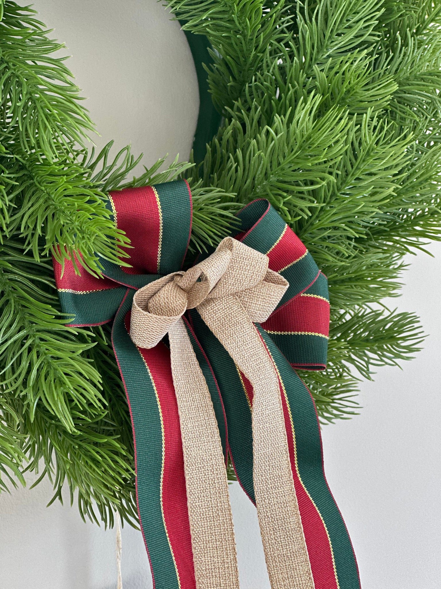 Wreath with handmade bow made from luxurious ribbons collected by Gavin